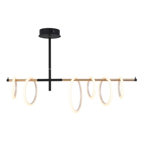 Linear Ring Pendant, 45 watt LED, 2900lm, made from steel with Acrylic lens. 1200mm long x 320mm wide x 840mm high. Rings can be placed in any order, powdercoated Matt Black with brass accents. Dimmable Driver built in to the ceiling plate